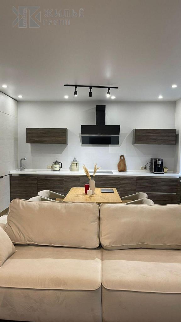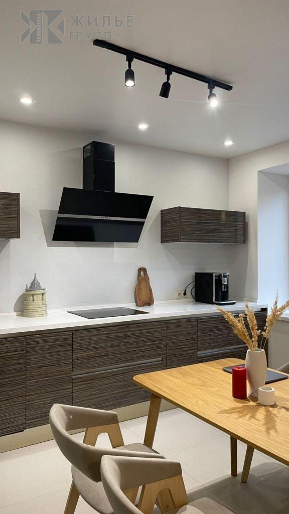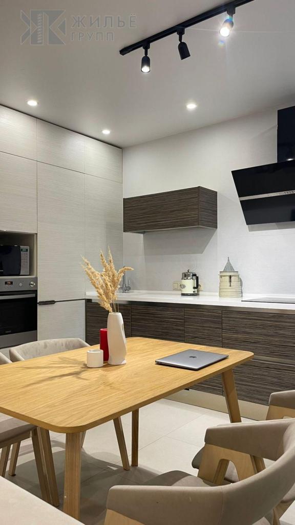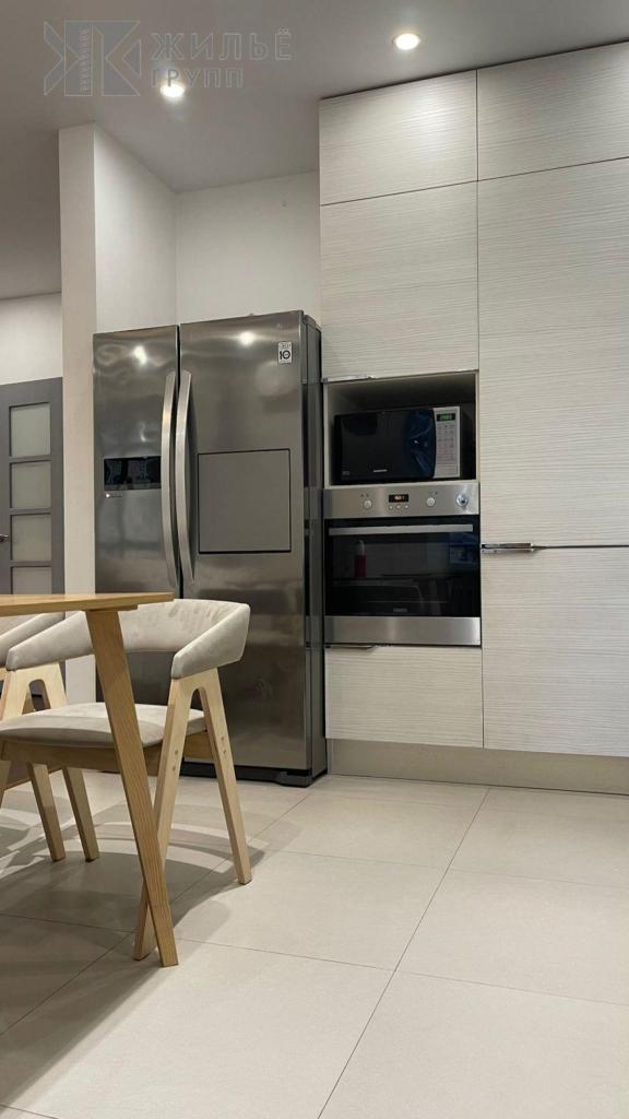 Кухня оснащена столешницей из искусственного камня, гарнитуром «Мария» от Blum. Есть встроенная посудомоечная машина, индукционная плита и двухкамерный холодильник LG.