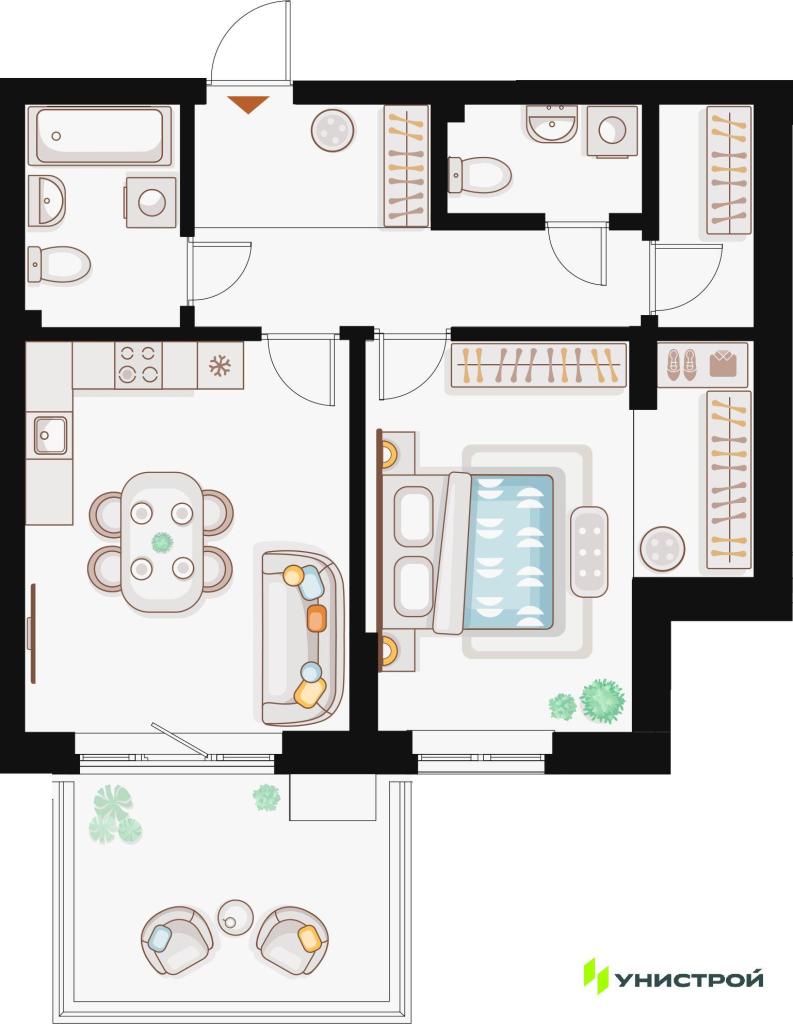 В квартирах выполняется предчистовая отделка с использованием качественных материалов: металлические двери, тепло- и шумоизоляция, энергоэффективные стеклопакеты, скрытая разводка коммуникаций и радиаторы с терморегуляцией.