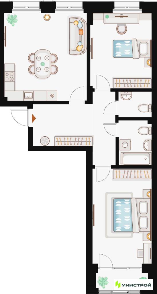 В квартирах выполняется предчистовая отделка с использованием качественных материалов: металлические двери, тепло- и шумоизоляция, энергоэффективные стеклопакеты, скрытая разводка коммуникаций и радиаторы с терморегуляцией.