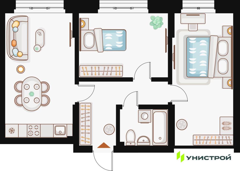 В квартирах выполняется предчистовая отделка с использованием качественных материалов: металлические двери, тепло- и шумоизоляция, энергоэффективные стеклопакеты, скрытая разводка коммуникаций и радиаторы с терморегуляцией.