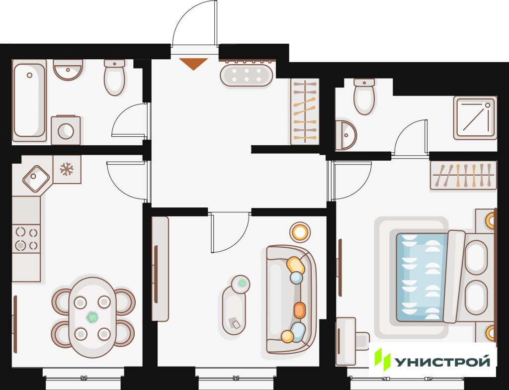 В квартирах выполняется предчистовая отделка с использованием качественных материалов: металлические двери, тепло- и шумоизоляция, энергоэффективные стеклопакеты, скрытая разводка коммуникаций и радиаторы с терморегуляцией.