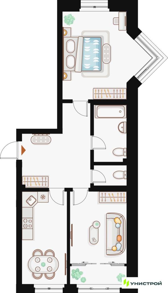 В квартирах выполняется предчистовая отделка с использованием качественных материалов: металлические двери, тепло- и шумоизоляция, энергоэффективные стеклопакеты, скрытая разводка коммуникаций и радиаторы с терморегуляцией.