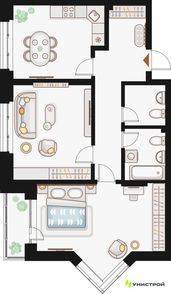 В «Q на Кулагина» предлагаются квартиры с террасами, евроварианты с просторными кухнями-гостиными, мастер-спальнями с ванными и гардеробными, тёплыми лоджиями и эркерами. На верхних этажах террасы позволяют любоваться видом на Волгу и Гребной канал.