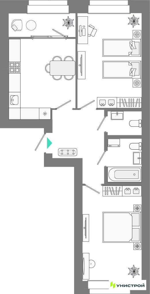 В комплексе будут представлены различные форматы квартир: с террасами на первых и последних этажах, мастер-спальнями, угловыми панорамными окнами, гардеробными и нишами для шкафов-купе. Также доступны квартиры с теплой лоджией, балконом или без него. В квартирах выполнена качественная предчистовая отделка.