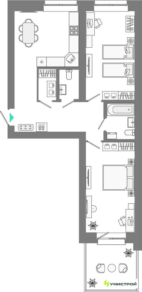 В комплексе будут представлены различные форматы квартир: с террасами на первых и последних этажах, мастер-спальнями, угловыми панорамными окнами, гардеробными и нишами для шкафов-купе. Также доступны квартиры с теплой лоджией, балконом или без него. В квартирах выполнена качественная предчистовая отделка.