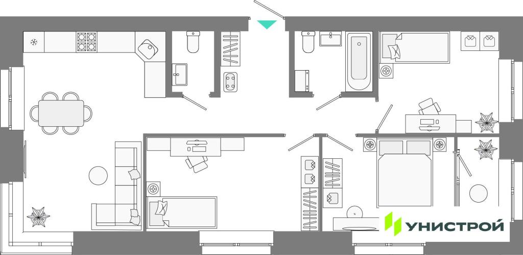 Представлен широкий выбор планировок — от студий до просторных семейных квартир. Доступны варианты с террасами, мастер-спальнями и гардеробными. Во всех квартирах выполнена качественная предчистовая отделка.