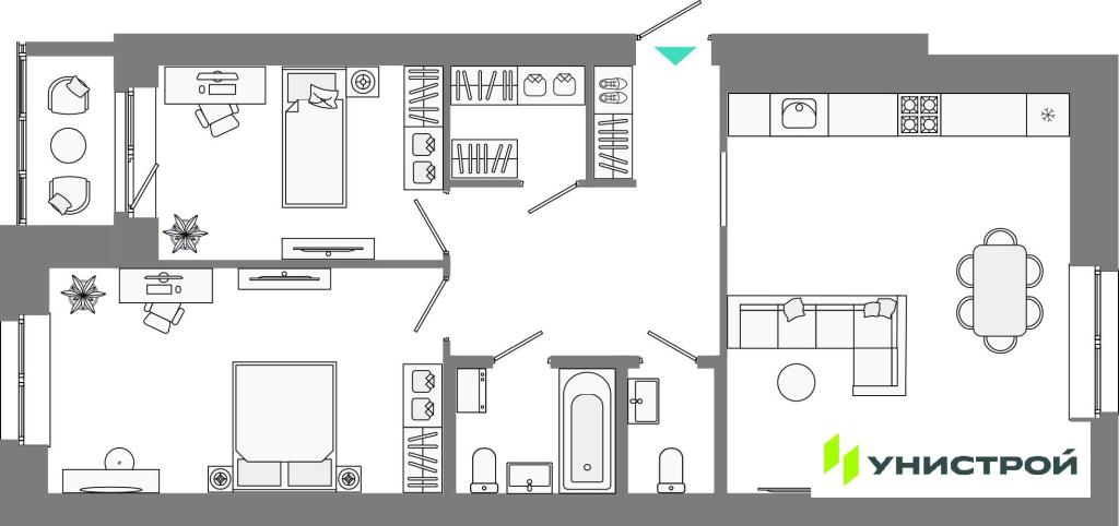 Представлен широкий выбор планировок — от студий до просторных семейных квартир. Доступны варианты с террасами, мастер-спальнями и гардеробными. Во всех квартирах выполнена качественная предчистовая отделка.